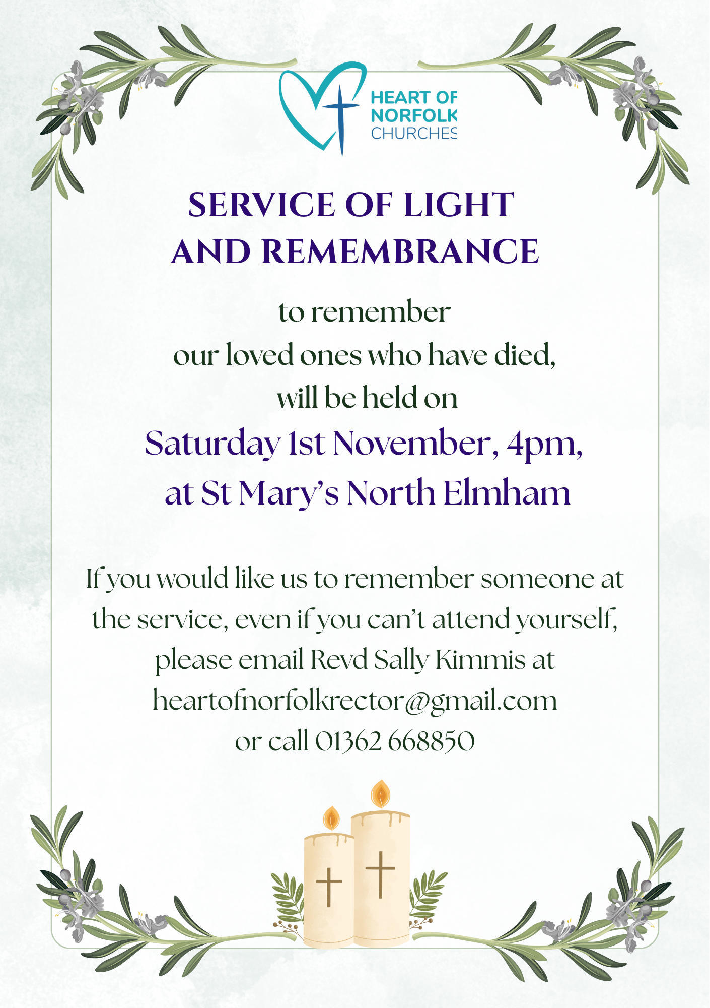 A Service of Light and Remembrance, to remember our loved ones who have died, will be held on Saturday 1st November, 4pm, at St Mary’s North Elmham, NR20 5JU.